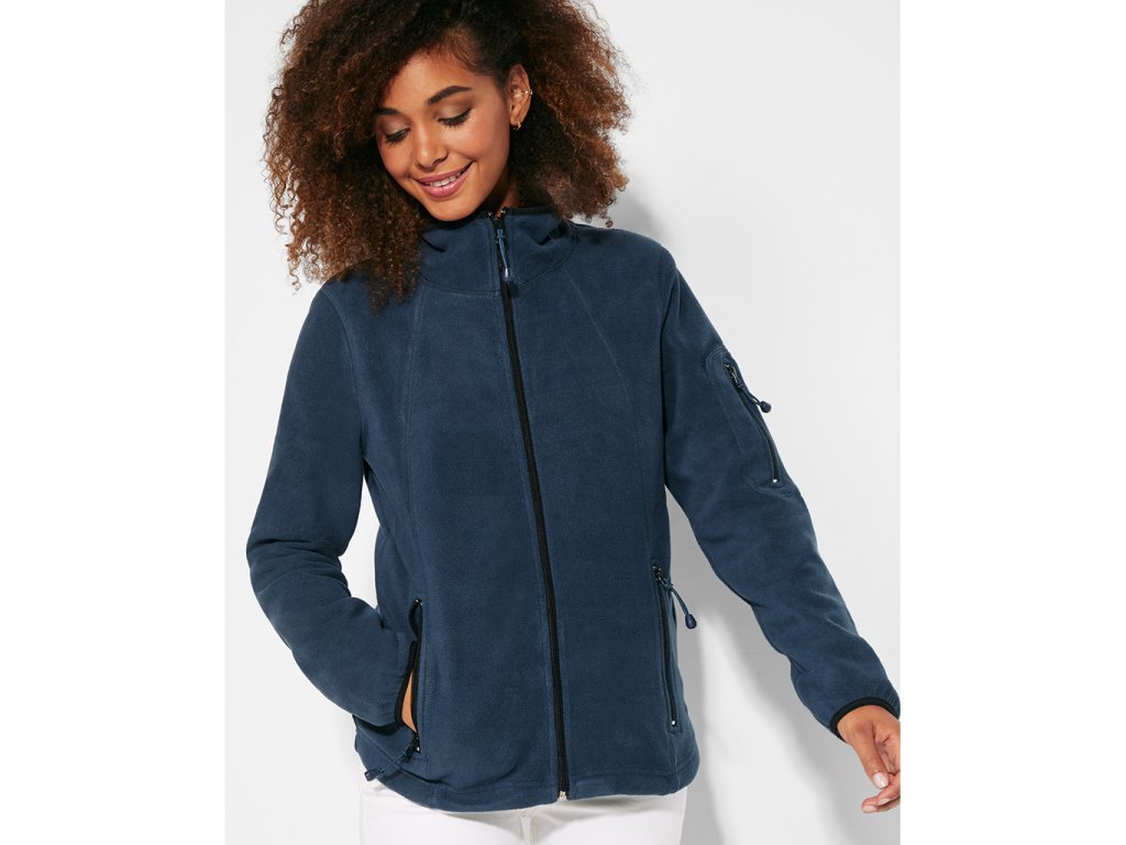 Dámská mikrofleecová sportovní bunda s vysokým límcem, dlouhým rukávem s lemováním v kontrastní barvě. Celolpropínací zip. Boční kapsa a kapsa na levém rukávu na zip. Prošívání na bočních stranách a na hrudi. Nášivka na lokti ze stejného materiálu.Doplňkové parametry
