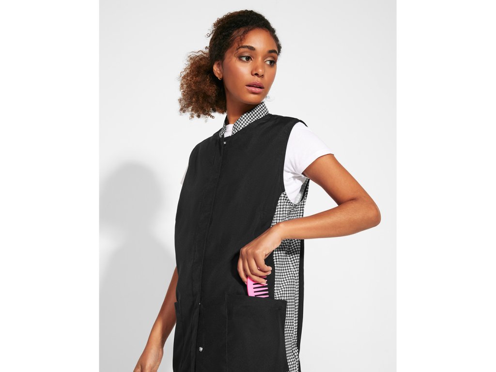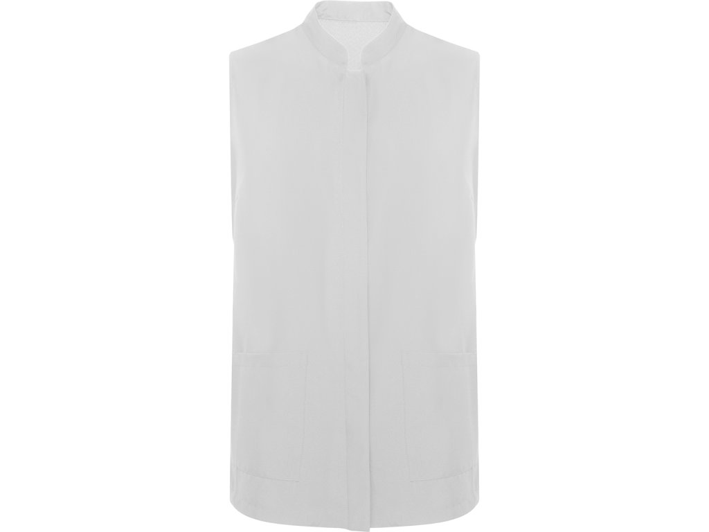 Dámská pracovní halena bez rukávů. Halena má přední skryté zapínání na druky, mandarínový límec, boční panely a záhyby na hrudi a dvě přední kapsy.Doplňkové parametry