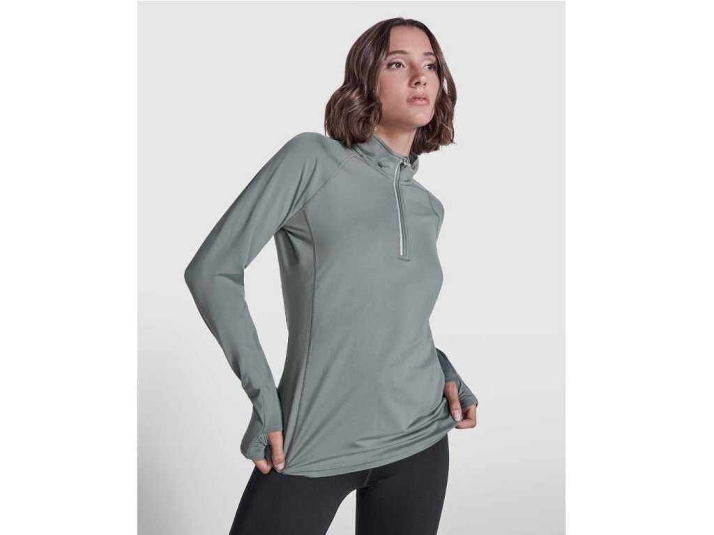 Dámská sportovní raglánová mikina s dlouhým rukávem a úzkým střihem. Límec s polovičním obráceným zipem s reflexním páskem. Zesílené kryty švů. Manžety s otvory na palec. Reflexní detaily na zadní straně. Zadní lem o něco delší než přední. Hřejivá kartáčovaná vnitřní tkanina.Doplňkové parametry