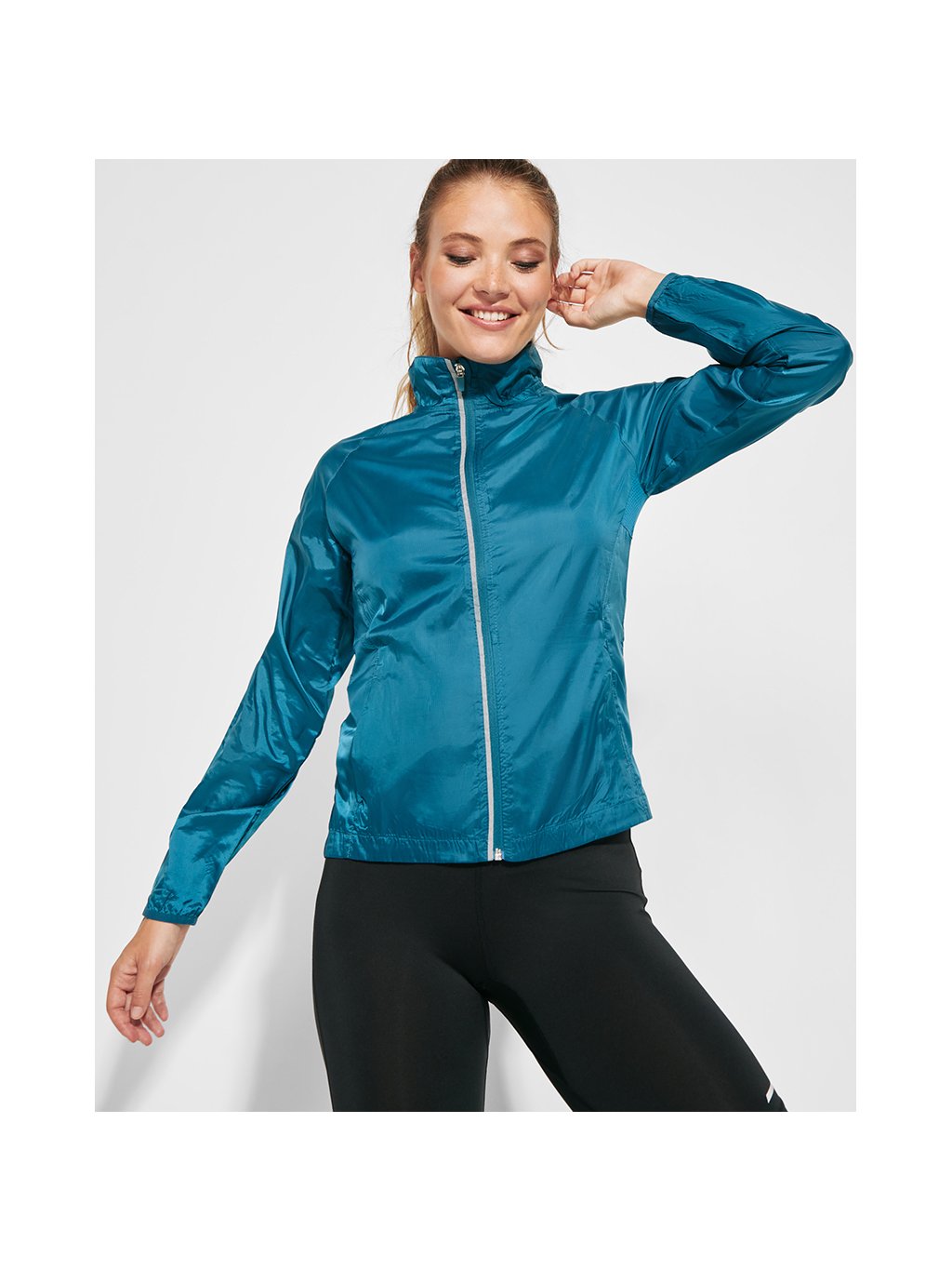 Dámská větrová bunda z lehké funkční látky bez podšívky. Vnitřní strana límce s podšívkou z prodyšné látky a prošitými švy. Obrácený zip s reflexním detailem, ochranou pro bradu a poutkem. Raglánový střih rukávů. Prodyšná látka v podpaží. Přední kapsy na zip. Přiléhavý střih. Vnitřní kapsa na uschování oděvu. Manžety s elastickou obrubou. Reflexní detaily na zadním díle. Trochu delší zadní díl. Odnímatelný štítek. Větrovka je odolná proti větru, nepromokavá a prodyšná. Látka má kostkovanou texturu. Duo koncept.Doplňkové parametry