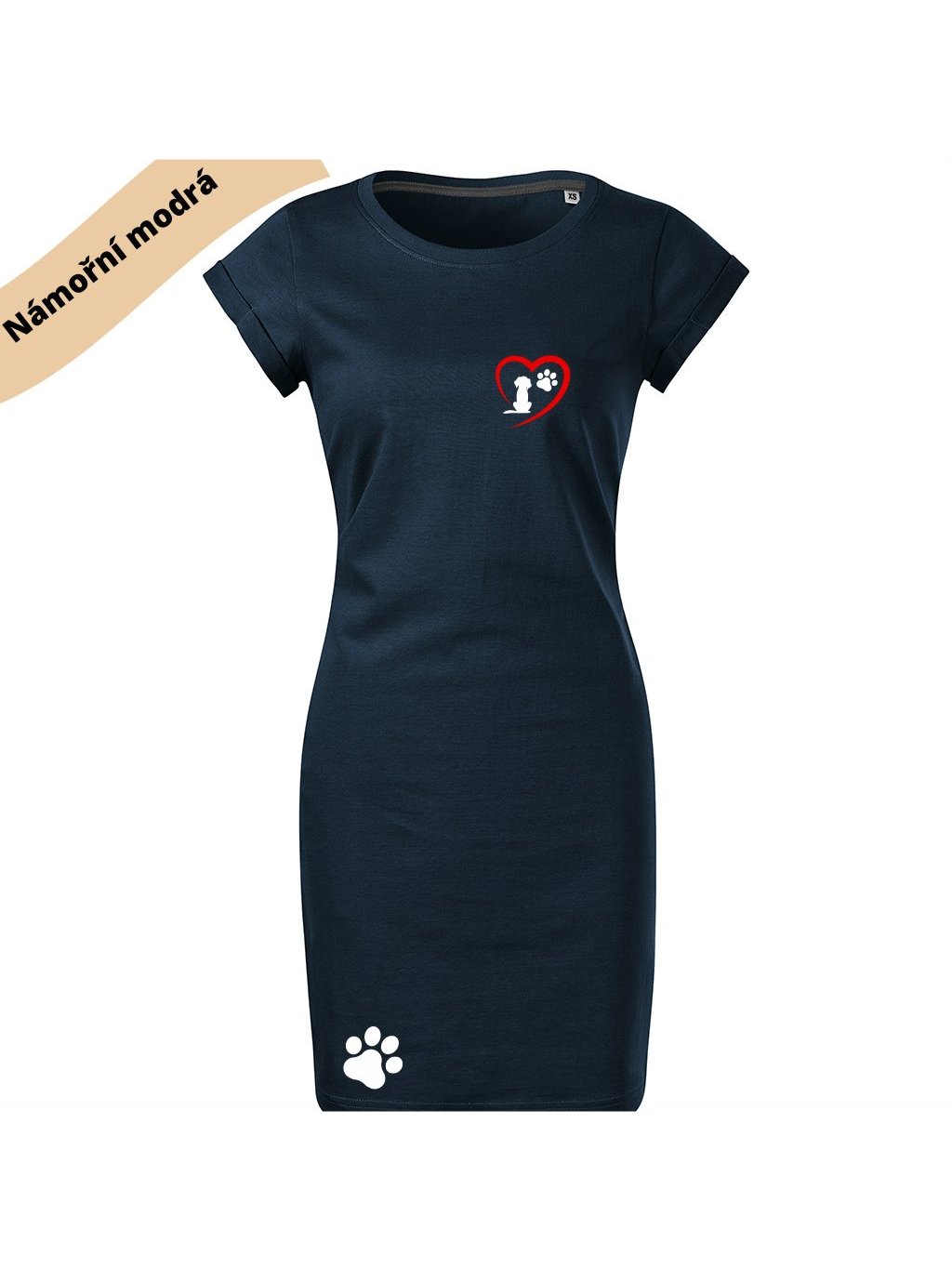Dámské šaty s potiskem námořní modrá vel. L ušité v ČR bez kapes - miluji pejsky