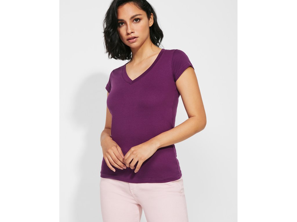 Dámské triko s krátkým rukávem a výstřihem do V. Vypasovaný střih s bočními švy.Doplňkové parametry