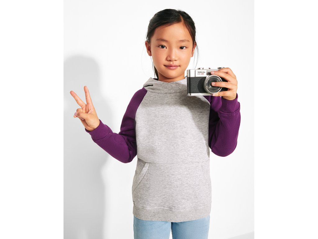 Pánská / dětská dvojbarevná mikina. Mikina má překřížený výstřih a kovové kroužky na šňůrky, kontrastní vnitřní kapuci a šňůrky, kontrastní rukáv raglánového stylu a klokaní kapsu. Manžety a spodní lem jsou s elastickým žebrováním 1x1. Mikiny v dětském provedení jsou dodávány bez šňůrek v kapuci. Odnímatelný štítek.Doplňkové parametry