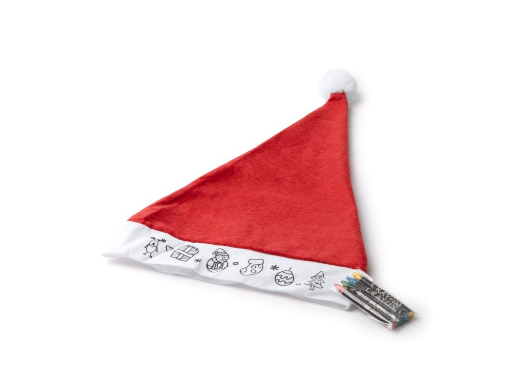Dětská vánoční čepice k vybarvování. Vánoční vzory na přední straně bílého pásku. Obsahuje 4 barevné pastelky.Doplňkové parametry