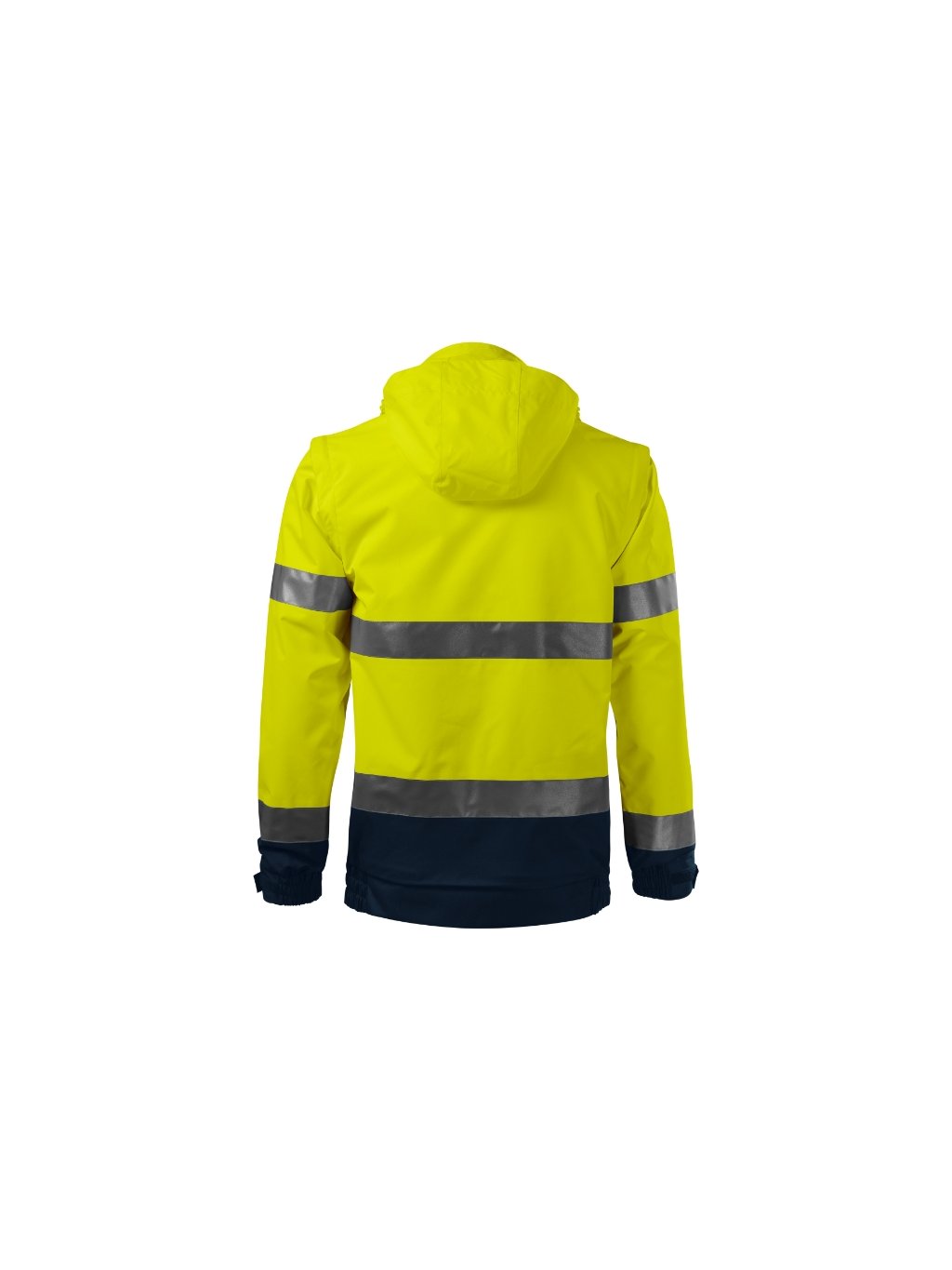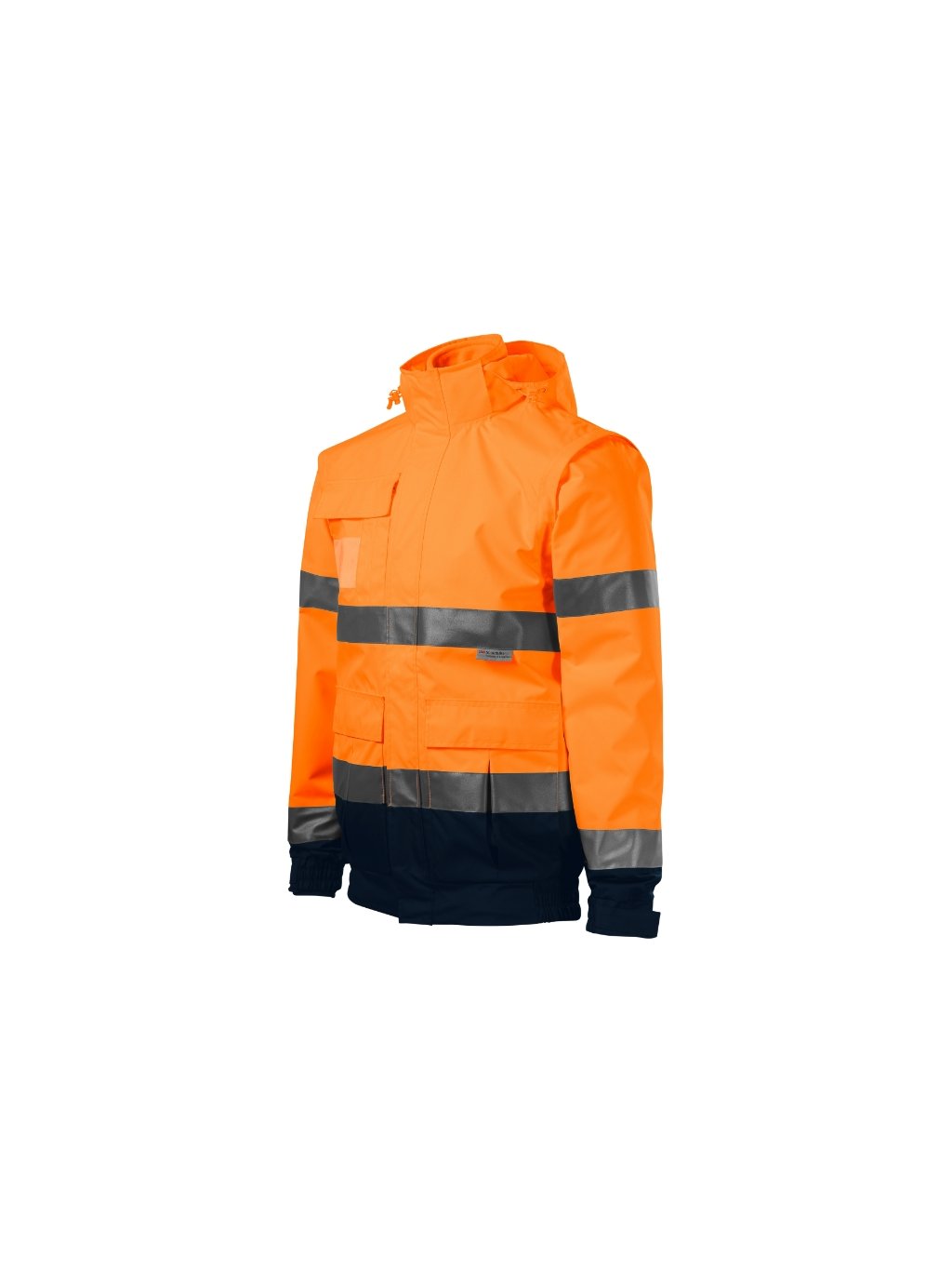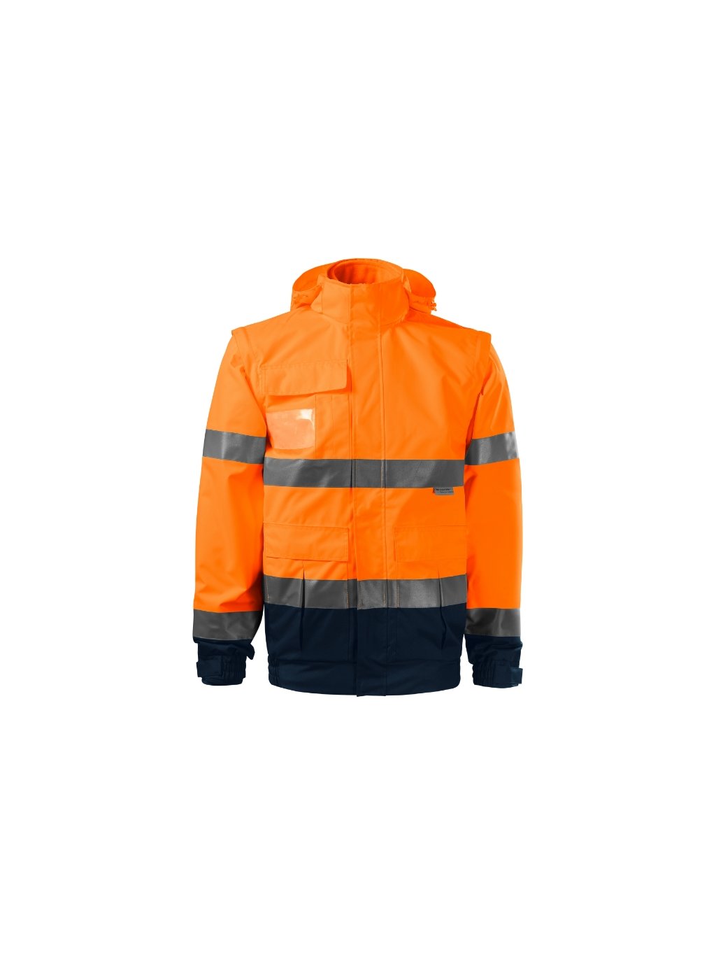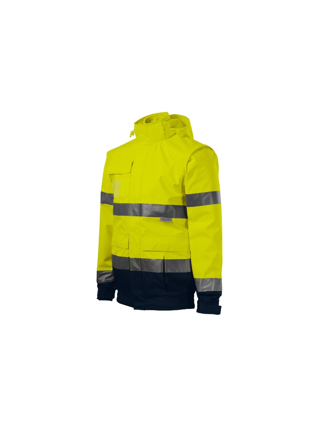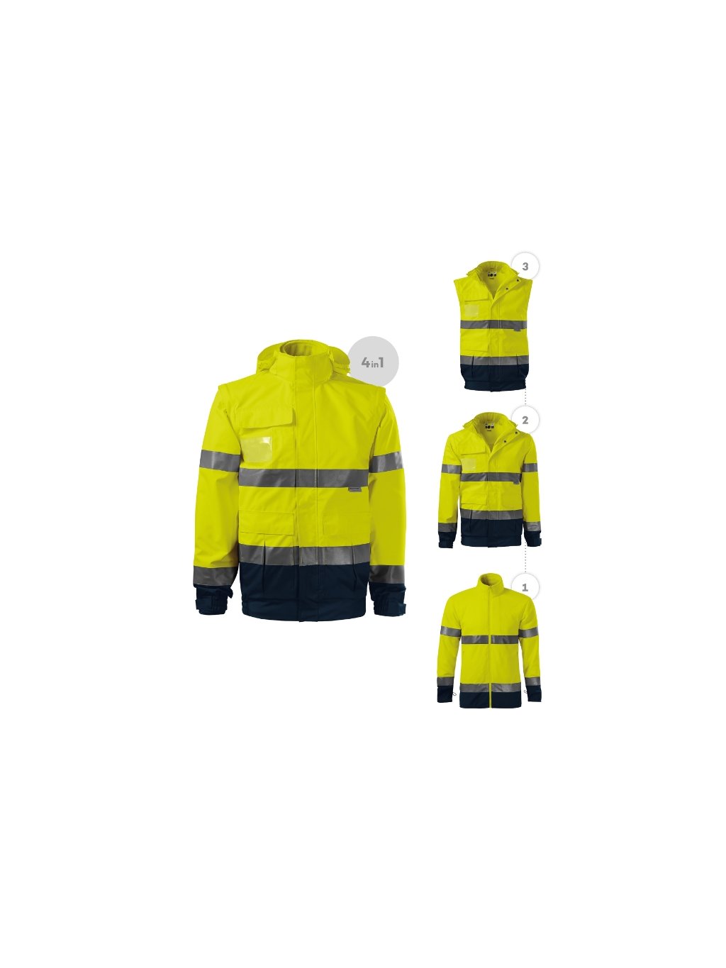 oděv s vysokou viditelností víceúčelové použití 4 v 1 v dvoubarevném provedení Svrchní bunda: voděodolný, prodyšný, fluorescenční materiál certifikované retroreflexní pruhy 3M celopropínací kostěný zip s klopou odnímatelná kapuce s vyztuženým kšiltem, skrytá v límci kapuce a dolní lem na stažení elastickou šňůrkou odnímatelné rukávy lemy rukávů stažené pruženkou, nastavitelné suchým zipem měchové kapsy s klopou a boční kapsy náprsní kapsa na zip s klopou kapsa na ID kartu a propisky podlepené švy vstup pro branding v podšívce zadního dílu certifikace dle norem EN ISO 20471/A1 (třída 3, 1), EN 343 (třída 4:1) a EN ISO 13688 Vnitřní fleece: odnímatelná vnitřní fleecová bunda hřejivý fluorescenční materiál certifikované retroreflexní pruhy 3M celopropínací kostěný zip kapsy s kostěným zipem lemování elastickým proužkem antipilingová úprava z obou stran certifikace dle norem EN ISO 20471/A1 (třída 2) a EN ISO 13688Doplňkové parametry