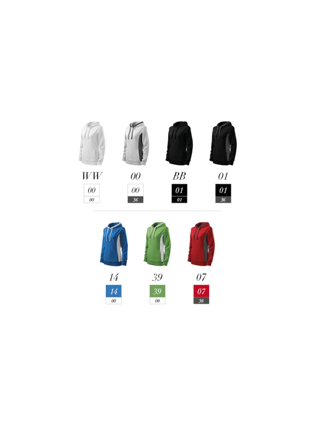 strečový materiál udržující stálost tvaru střih tvarovaný bočními díly kapuce s podšívkou, na stažení šňůrkou lištové kapsy ve stylu klokanky dolní lem, manžety a lem kapuce z žebrového úpletu 2:2 s 5 % elastanu kontrastní prvky (vyjma barev BB a WW) vnitřní strana nepočesanáDoplňkové parametry
