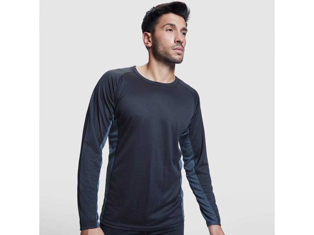 Pánské funkční triko s dlouhým rukávem. Kombinace dvou polyesterových tkanin. Hlavní materiál: 100% polyester-honeycomb, boční panely: 100% mikroperforovaný polyester. Raglánové rukávy. Kulatý výstřih, zpevněné švy na průkrčníku. Pohodlné a snadno přizpůsobivé.Doplňkové parametry