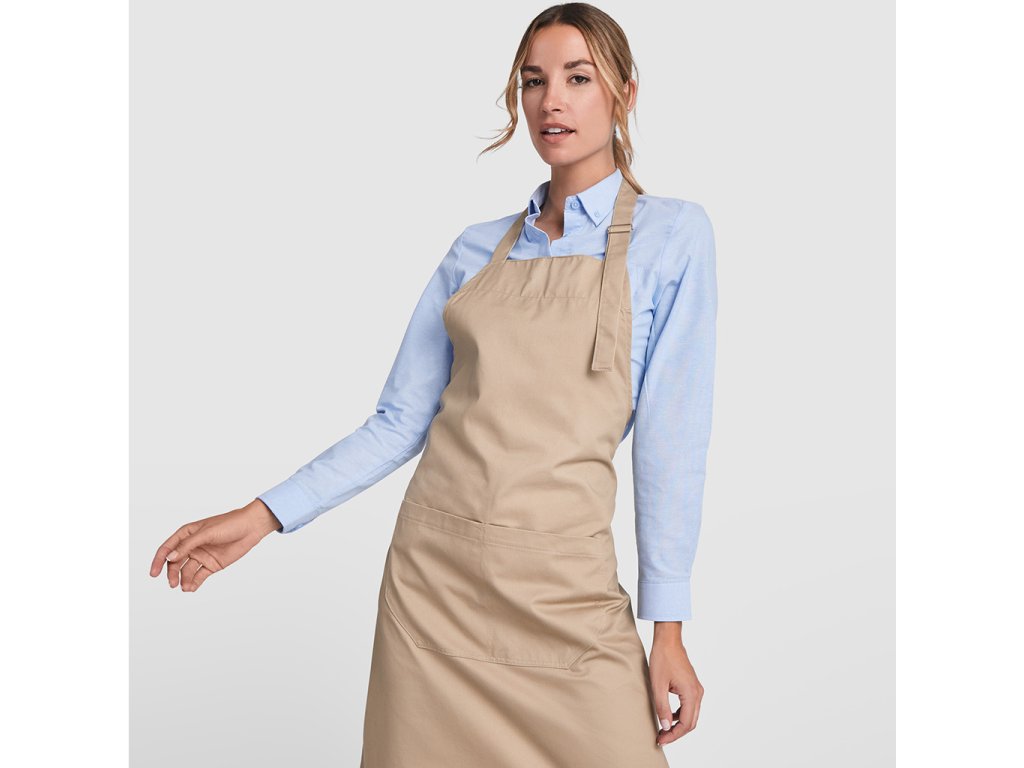Dlouhá keprová zástěra z recyklovaného polyesteru a bavlny. Popruh na krk s nastavitelným zapínáním. Boční stahovací popruhy. Dvě přední kapsy.Doplňkové parametry